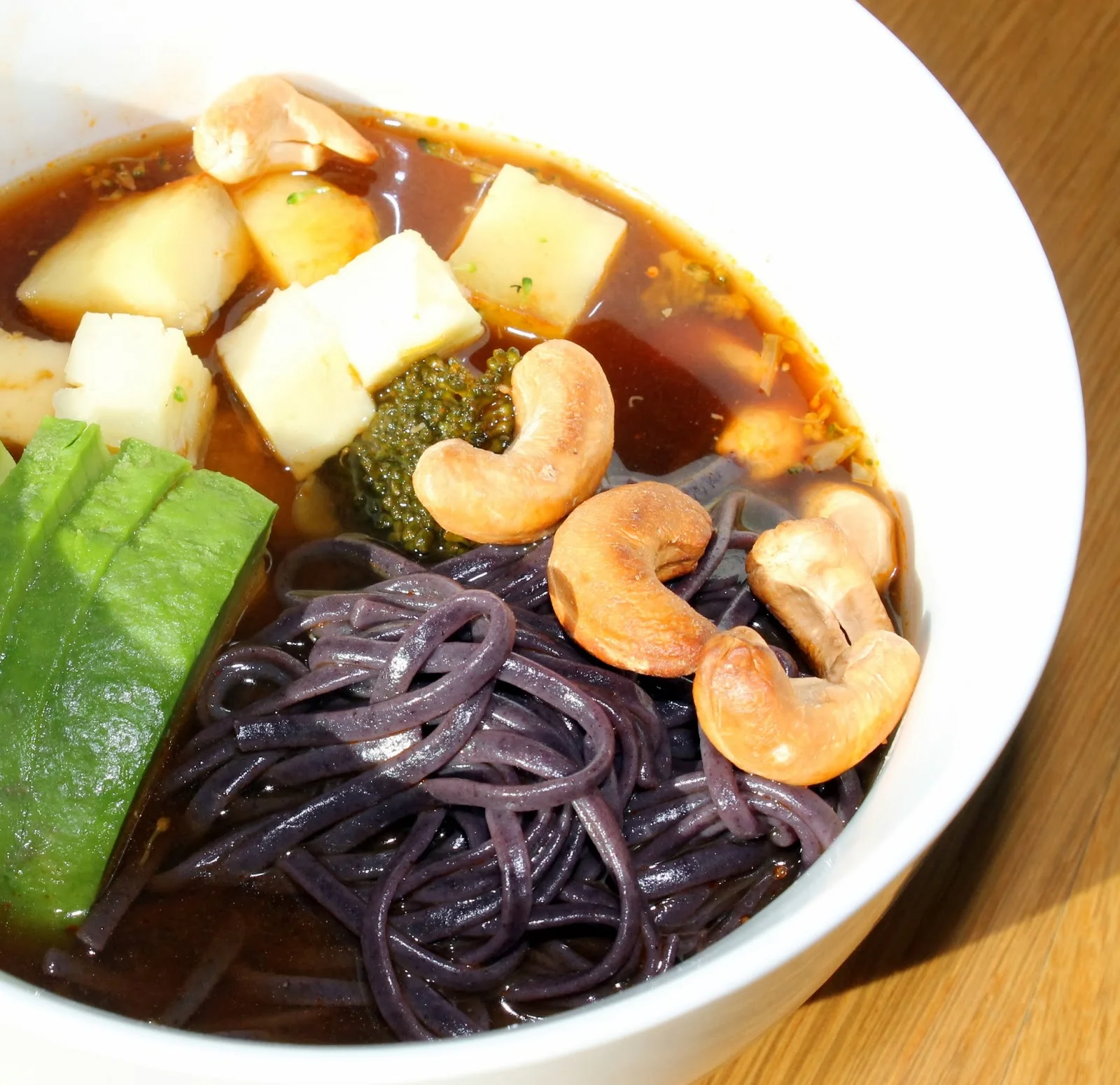 - Ladle soup into bowls and top with paneer, noodles, avocado, cashews, and herbs. Enjoy with a spoon and fork!