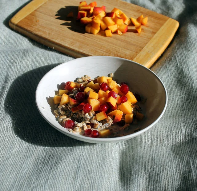 If you cannot find rolled spelt or are gluten-free, using only rolled oats is also delicious. But either way, I prefer a quick toasting of the oats and nuts before soaking because it helps the oats absorb the liquid while keeping some shape, and it adds a deeper nutty element to the end product. The morning of, stir in chia seeds for an Omega 3 boost and to firm up the mixture and top with seasonal fruit; right now I am enjoying the contrast of tangy red currant and juicy, sweet nectarine. In the fall I like to add grated apple and pear.