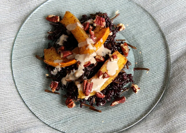 Wild Rice with Roasted Delicata Squash, Sweet Tahini Sauce, and Pecans