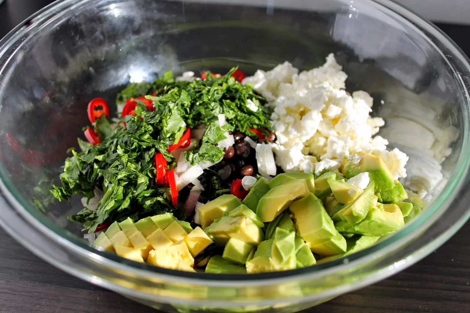 - Add lime juice and next four ingredients (through salt) to a medium mixing bowl. Whisk to combine. Add remaining ingredients and toss gently to combine.
