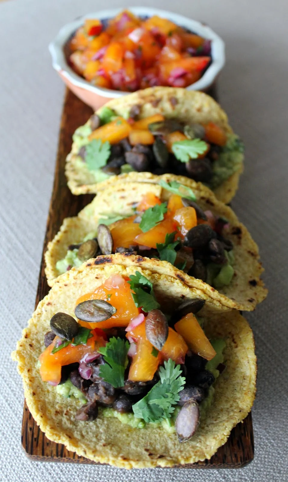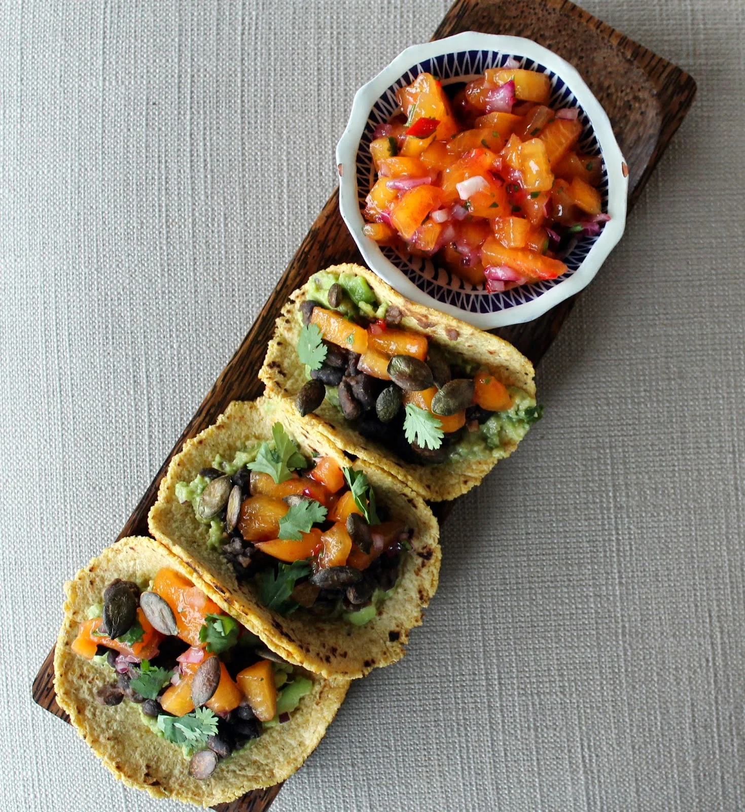 Avocados are given a quick mash-up with lime, chili, and cumin while black beans stew on the stove with garlic, cumin, and smoked paprika. The persimmon salsa is a fresh, zingy, sweet, and welcome counter to the smoky beans and guacamole. If persimmons are not in season or you can't find them, mango would be a perfect substitute.