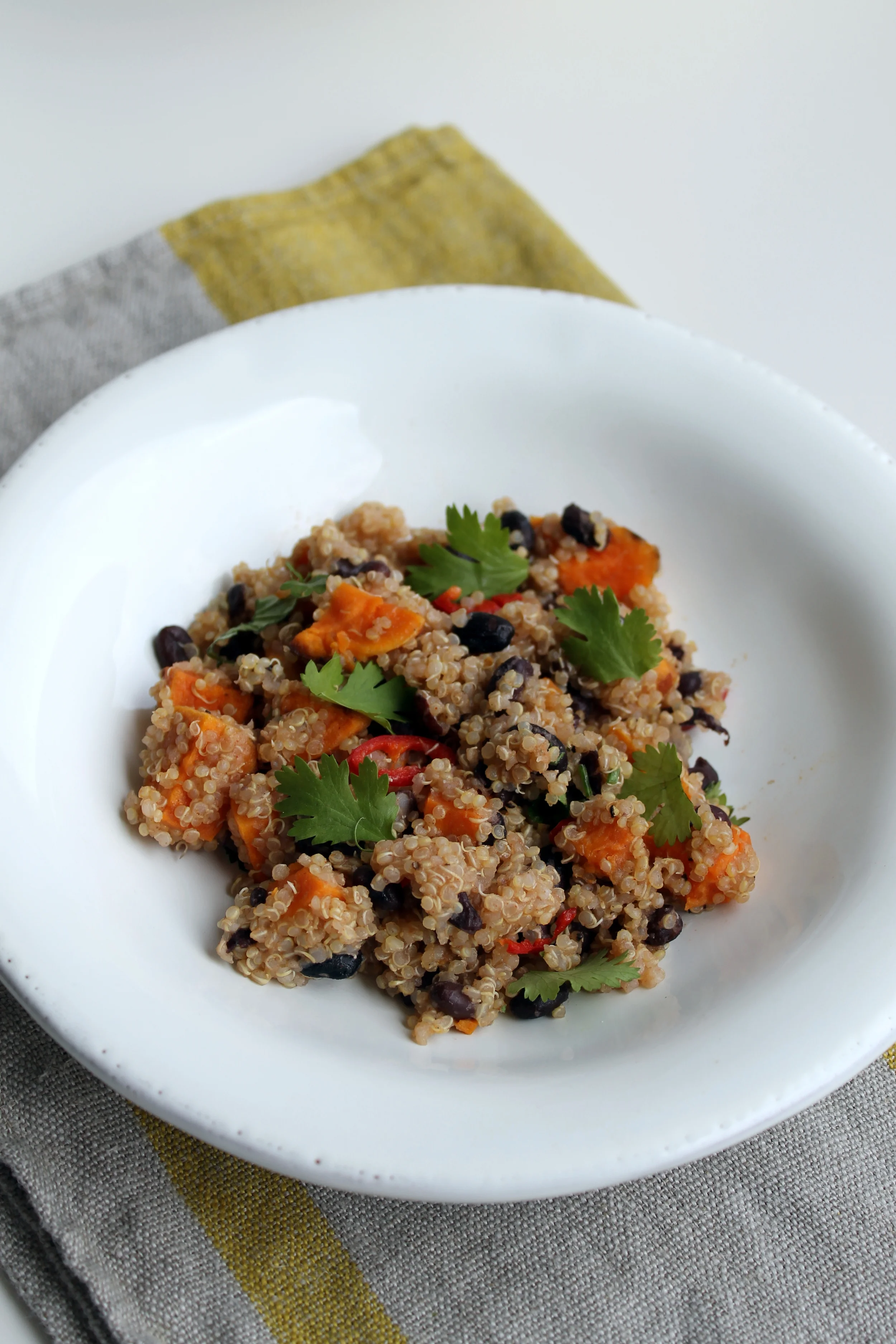 - Add cooked sweet potato, quinoa, black beans, salt, chili if using, and cilantro to the bowl with the dressing and gently toss to combine. Serve immediately or at room temperature.