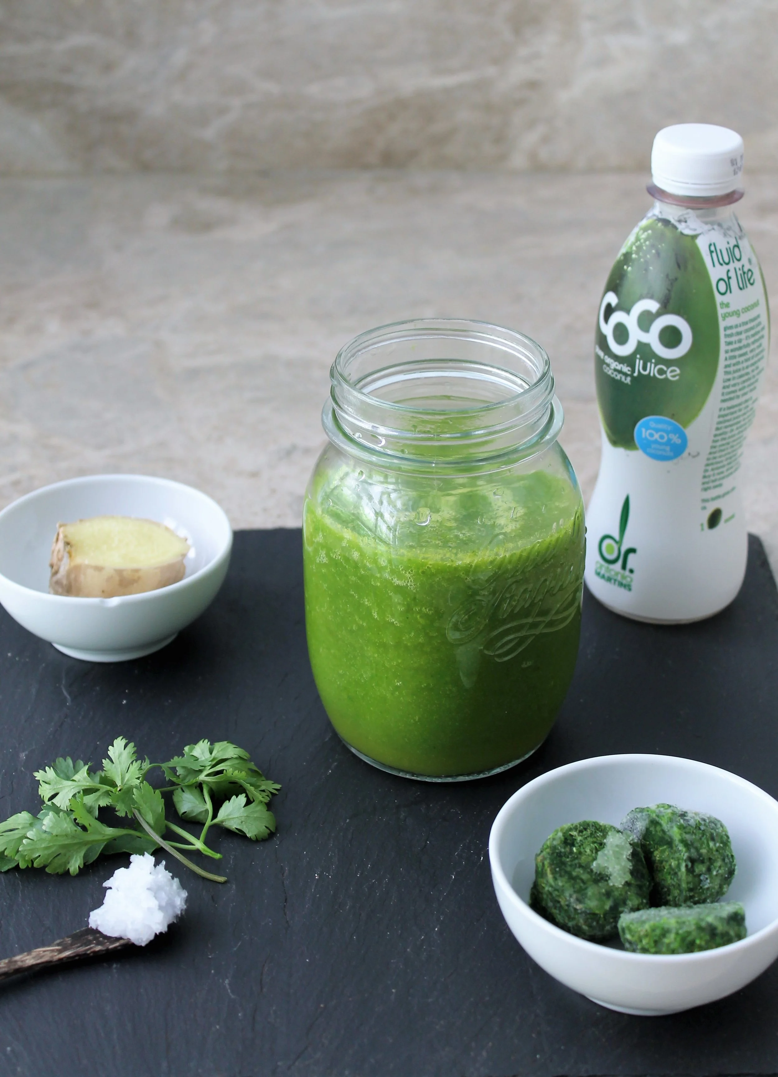 This green juice is inspired by a ginger-spiked coconut water I had at a café in Madrid earlier this summer. Appropriately named Spicy Coconut, it was a simple blend of coconut water, ginger, and spinach. My at-home version comes with a few additions: cilantro for brightness and mango for a touch of sweetness and body. Ginger adds a warming kick that helps our body adapt to the summer heat. (Remember the last video?) Of course you can adjust the amount to taste. But the key to easy sipping is letting your blender run a while to ensure it breaks down all the fibers and becomes super smooth. If you do this, it drinks like a juice without the effort of juicing or straining. A perfectly hydrating afternoon pick-me-up.