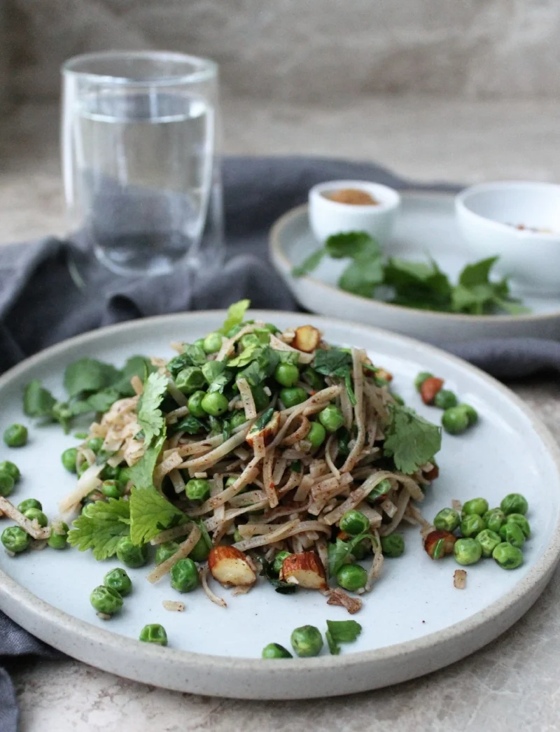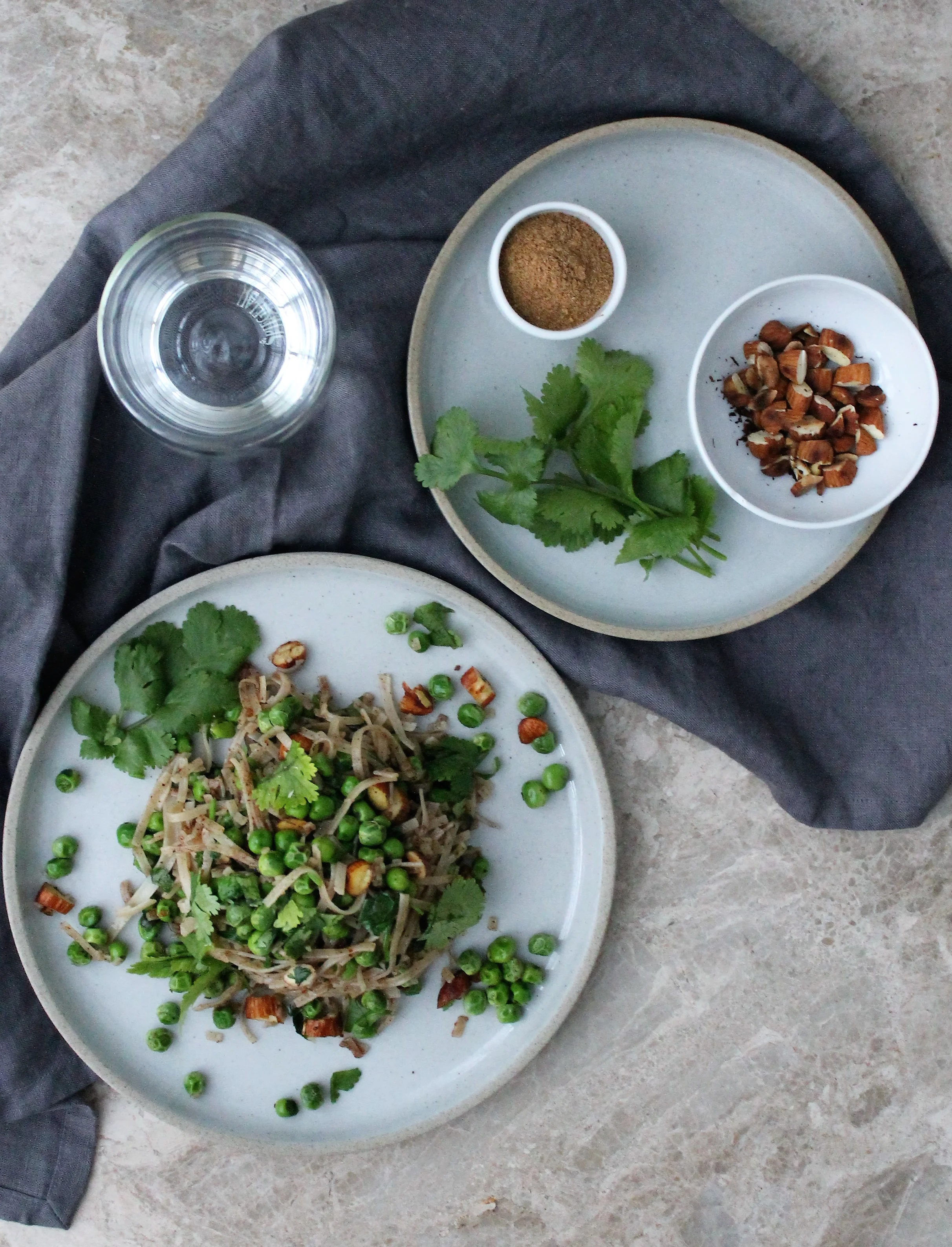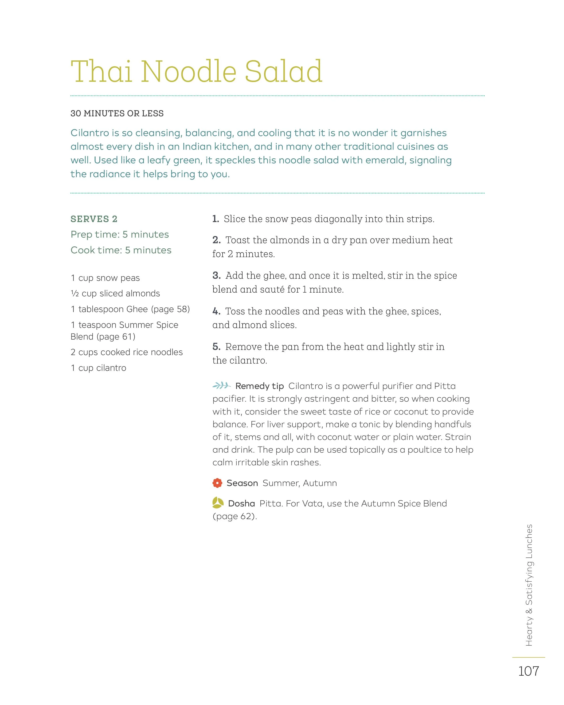 But this is a cookbook after all, and Laura's recipes deserve all the spotlight because they land precisely at that crossroads of nourishment and satisfaction I mentioned earlier. The Thai Noodle Salad I'm sharing today is a perfect example. There's something incredibly warming and satisfying about mixing up a new spice blend, warming it in ghee and tossing it with chewy brown rice noodles, snow peas (in my case frozen peas, adapted to the current winter season), crunchy toasted almonds, and plenty of bright cilantro. Make the spice blend in advance, and dinner will be on the table in 15 minutes, no joke.